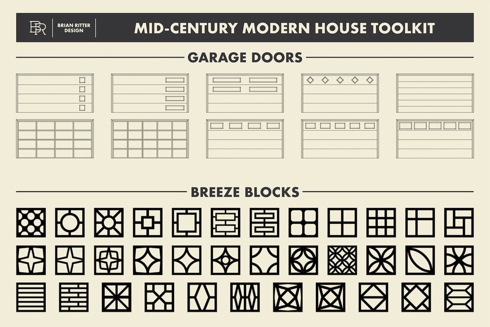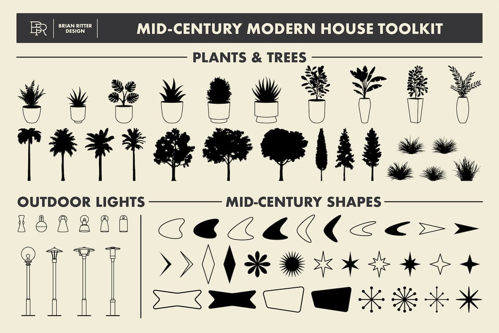 This is a collection of architectural elements to make drawing mid-century modern homes and retro atomic ranch houses faster and easier.