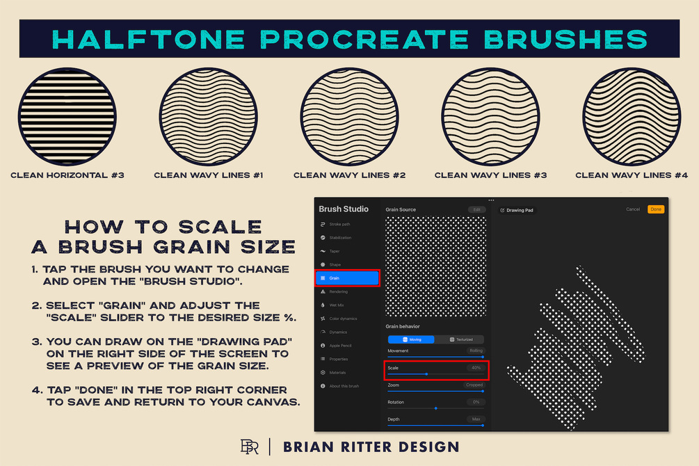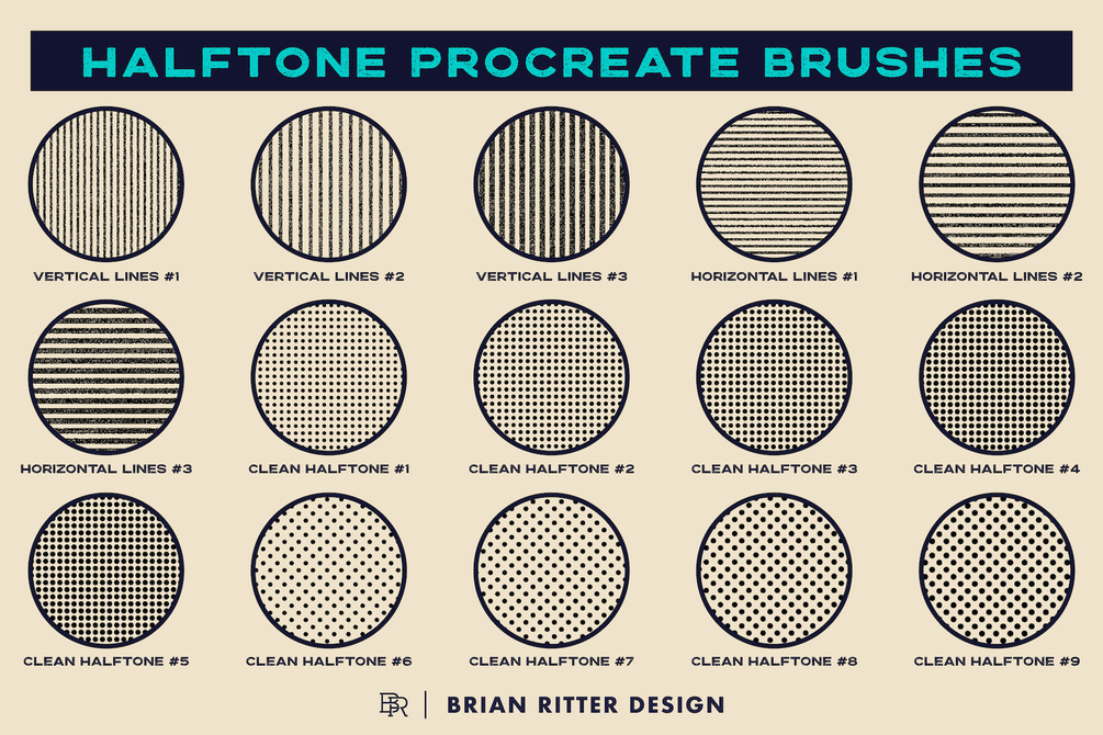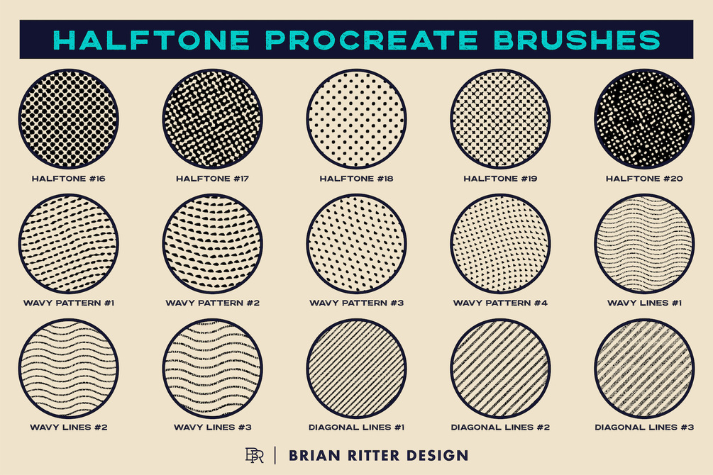 What's included: Procreate brush set including: 30 Distressed & Clean Halftone Dot Brushes, 4 Distressed Wavy Pattern Brushes, 7 Distressed & Clean Wavy Line Brushes, 6 Distressed & Clean Diagonal Line Brushes, 6 Distressed & Clean Horizontal Line Brushes, 6 Distressed & Clean Vertical Line Brushes, 3 Clean Star Pattern Brushes, 3 Clean Diamond Pattern Brushes, Brush reference guide PDF