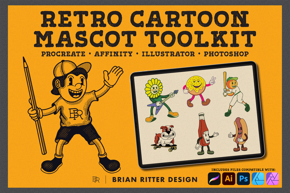 A collection of time-saving stamp brushes and Procreate ink brushes for drawing retro style cartoon characters & mascots.